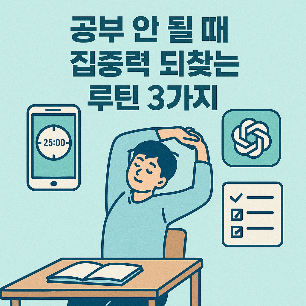 “책상에 앉아도 10분이면 스마트폰부터 찾는다…”누구나 겪는 공부 슬럼프.그럴 땐 의지를 탓하기 전에, 루틴을 점검해보세요.오늘은 2025년형 집중력 회복 루틴 3가지와 함께AI 도구 활용법까지 정리해드립니다.✅ 1. 뇌를 깨우는 ‘3분 움직이기’📌 실천법:알람이 울릴 때마다 3분간 가볍게 스트레칭제자리 점프, 손목 돌리기, 눈 감고 심호흡📌 왜 효과적일까?두뇌 혈류량 증가 → 산소 공급 → 집중력 회복루틴화되면 몸이 공부모드로 자동 전환📌 추천 도구:ChatGPT에 “3분 집중 루틴 짜줘”라고 명령하면 개인화 가능!✅ 2. 환경 설정: 공부 전 ‘정리 타이머’📌 실천법:공부 시작 전 5분 타이머 설정책상 정리, 불필요한 앱 종료, 노트 한 페이지 열기📌 왜 효과적일까?‘심리적 시동’을 거는 짧..